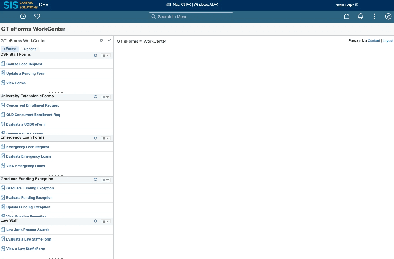At Berkeley, eForms are accessed with outdated and inefficient methods, through either a search function or the long list of eForms in the GT eForms Work Center.