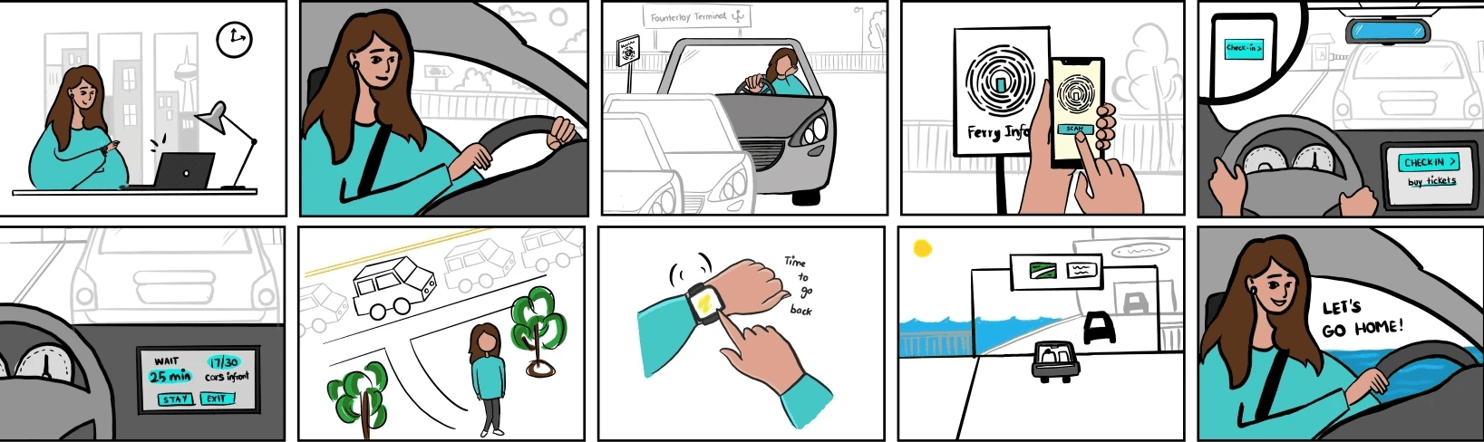 To document the full journey of a WSF drive on passenger and visualize the timing of notifications, the check in process, and the physical environment of waiting in line, we created a storyboard.