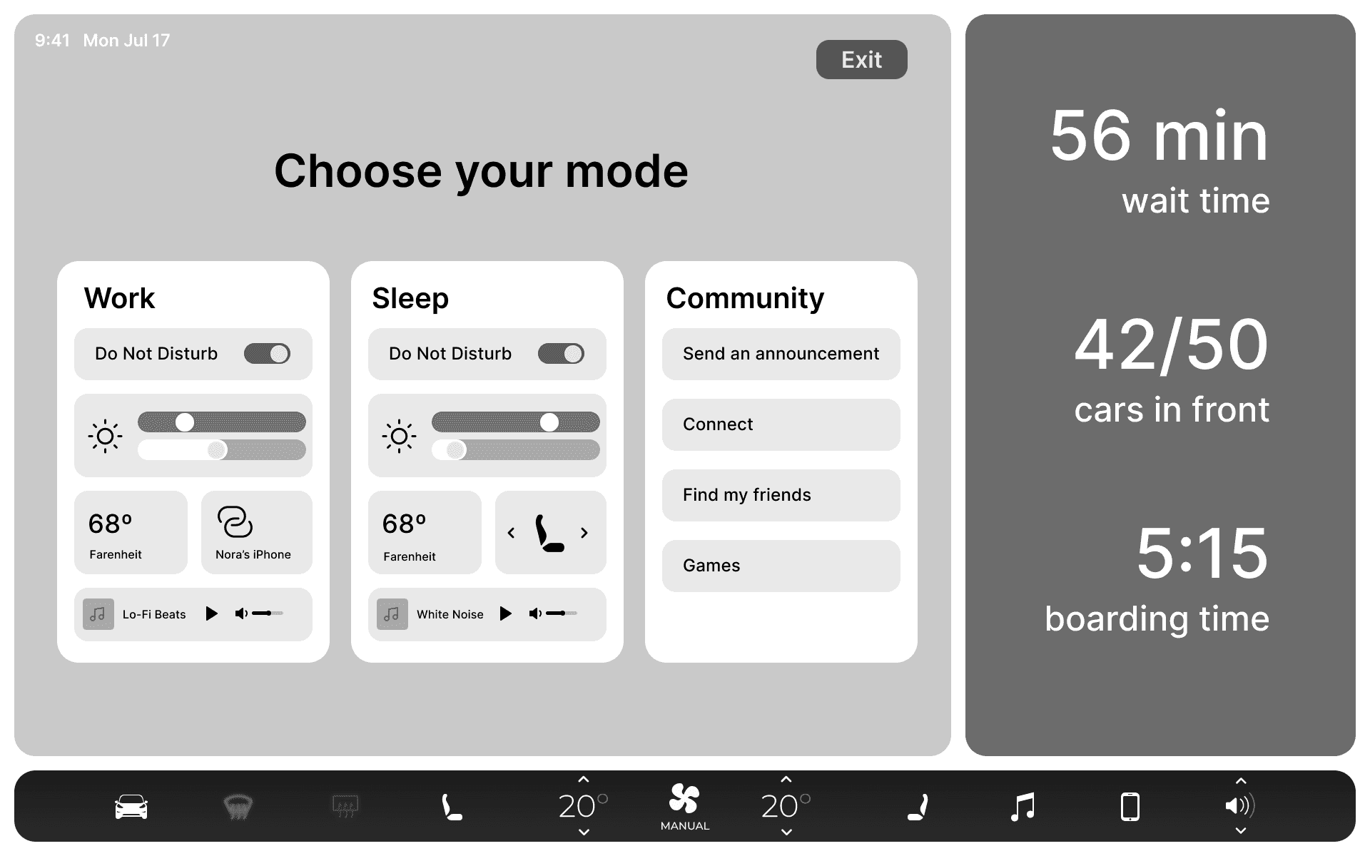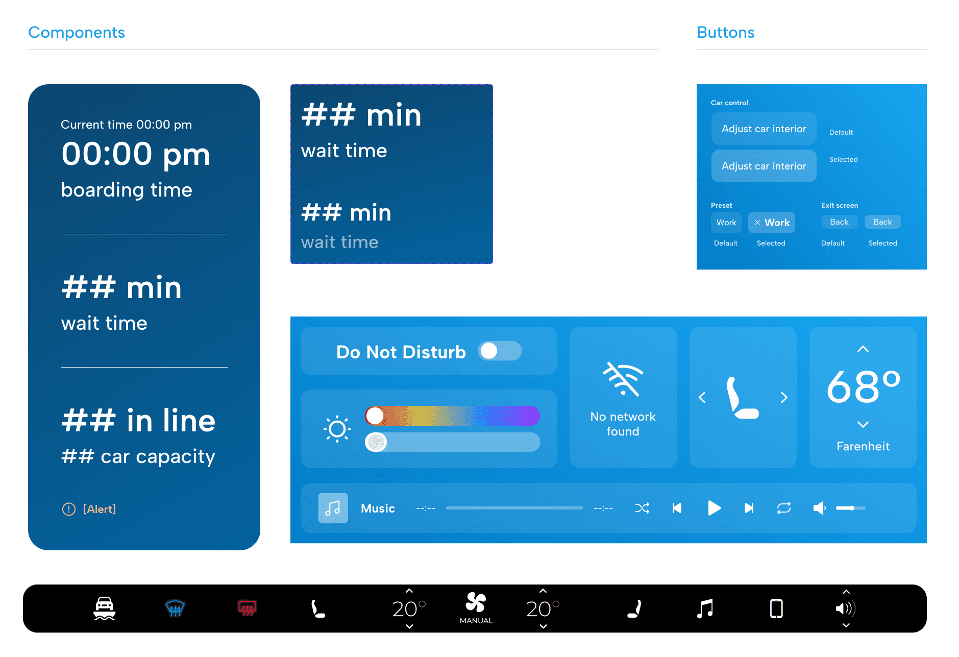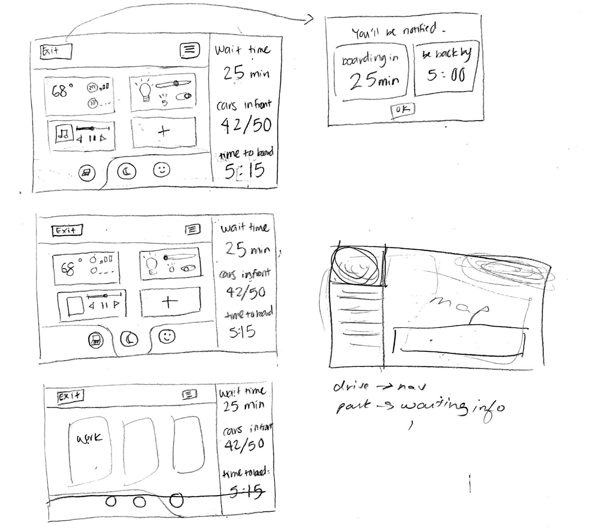 I started my wireframing process with sketching. Since it was my first time designing for an HMI, I looked into existing conventions to gain an understanding of the screen proportions.