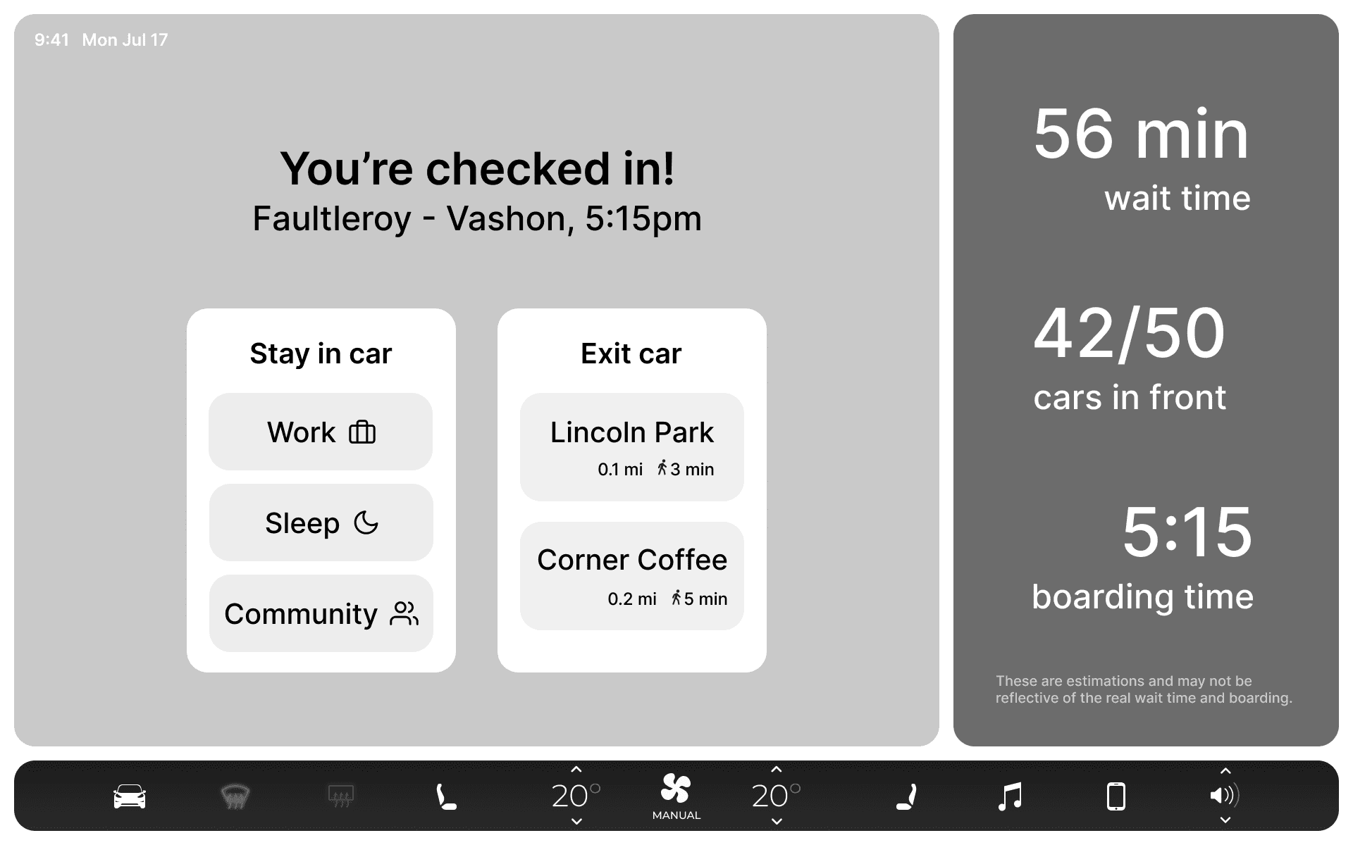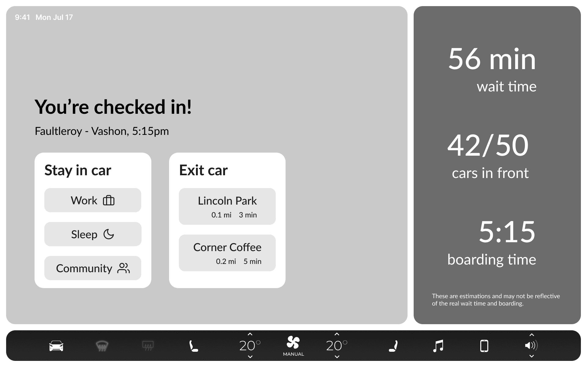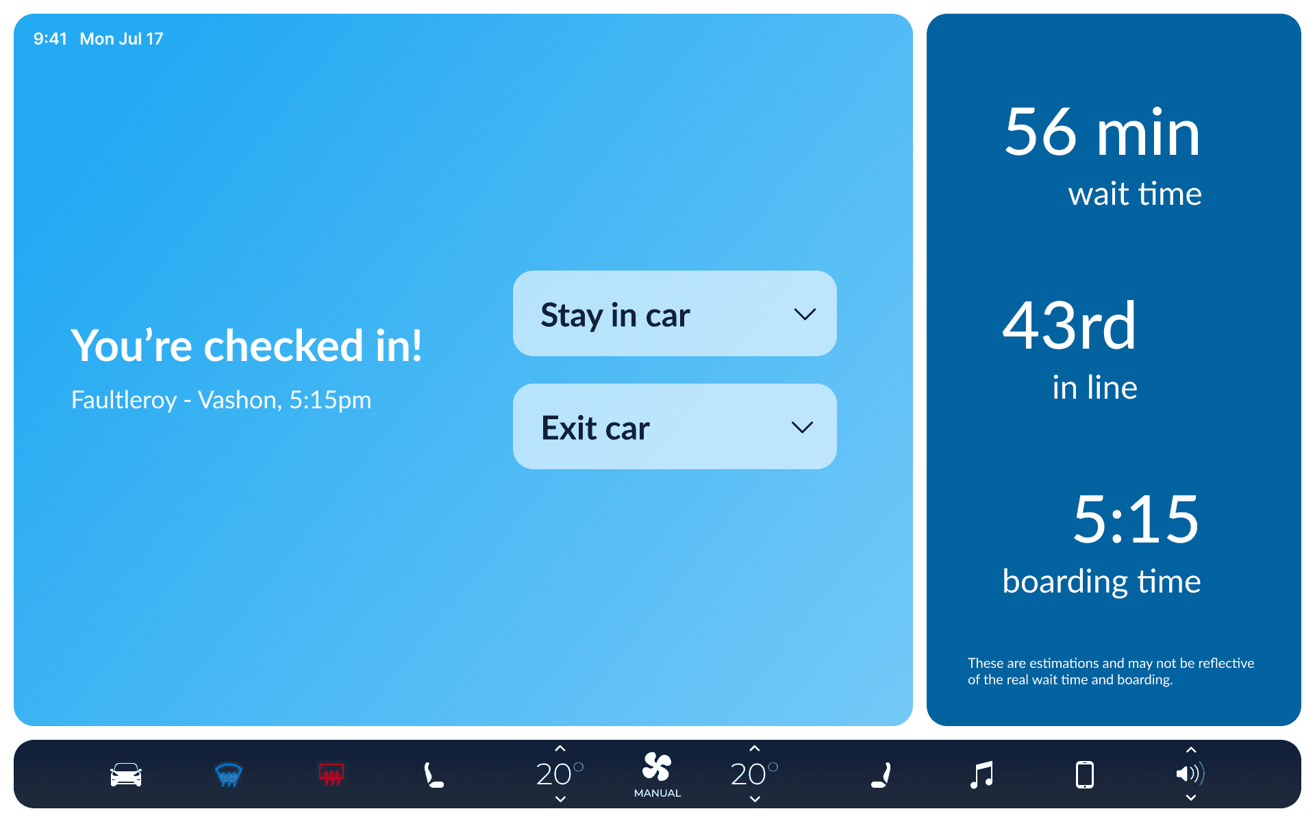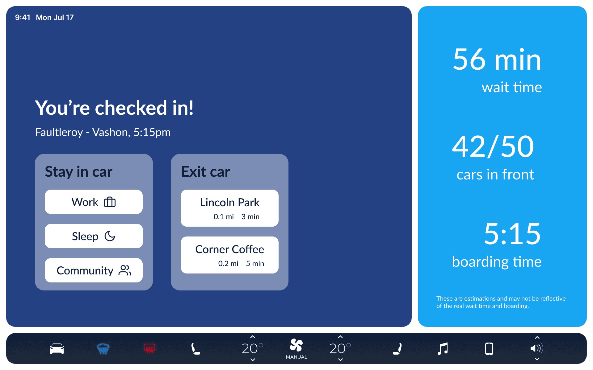 Prompted through a geofence at ferry terminals, checking in allows Stream to calculate the wait time and ferry car capacity based on cars that have checked in, location of cars, and size of cars.