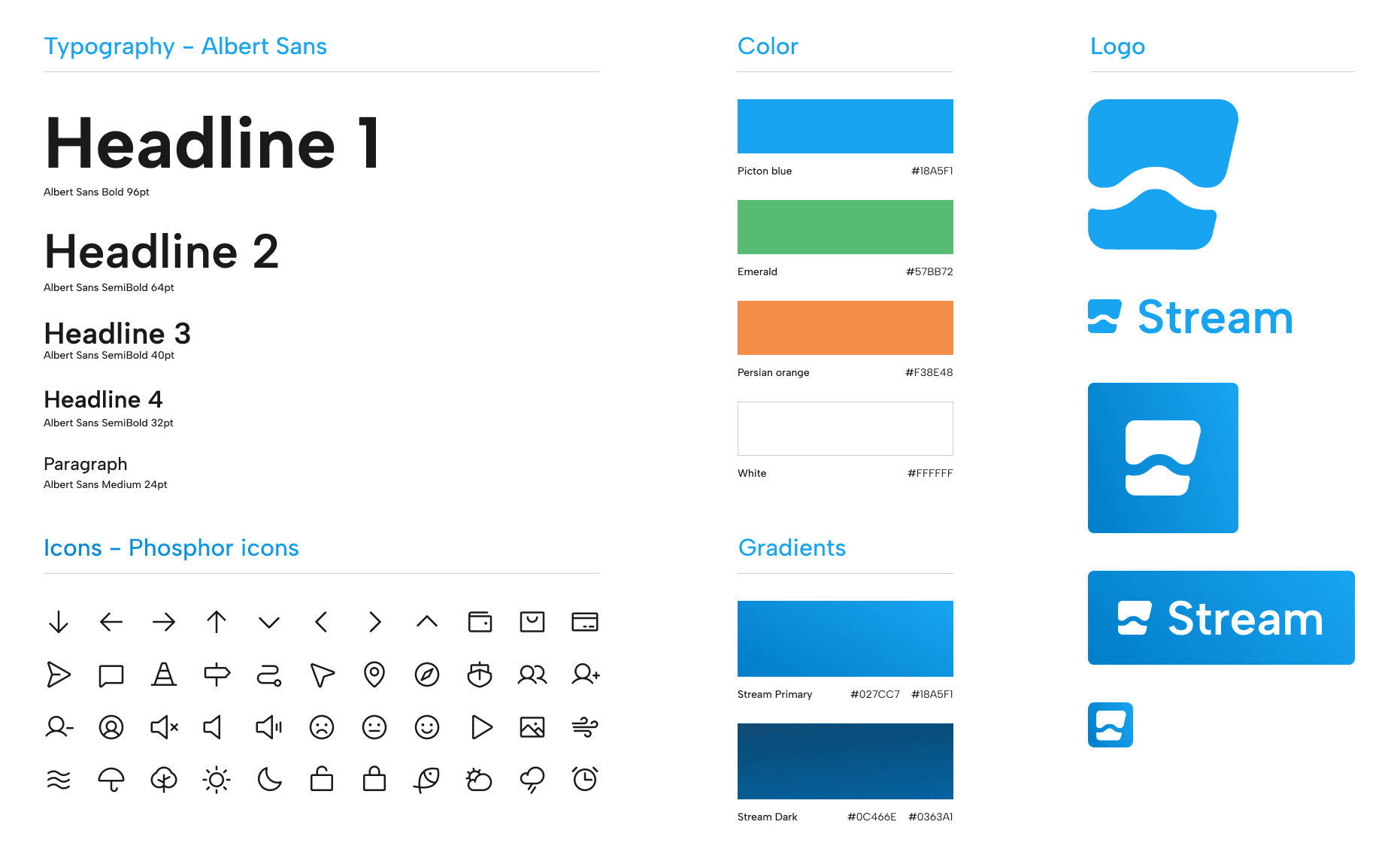 The below colors, gradients, fonts, and components became the visual identity & design system of Stream to communicate its reliability and support its information relay.